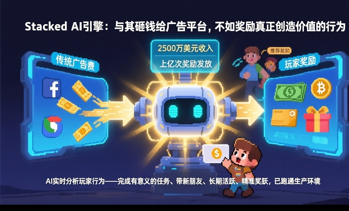 我说说第二个,项目用AI和数据精准分发奖励。 时间就在今年的3月,@Pixels推出了AI奖励基础设施Stacked,把游戏厂商原本用来买广告的钱直接发给玩家。我估计项目的想法是与其把钱砸给广告平台,不如奖励那些真正在游戏里产生价值的行为,比如完成有意义的任务、带新朋友玩、长期活跃。项目的AI可以实时分析玩家行为,判断哪些人即将流失、哪些行为是真正的留存信号哪些人真的具备价值,然后精准把奖励给到合适的人手里。我看到这套系统已经在生产环境跑通了,帮Pixels项目赚了超过2500万美元,(换成人民币这可是一点几个亿啊)据说还帮着处理了上亿次奖励发放。