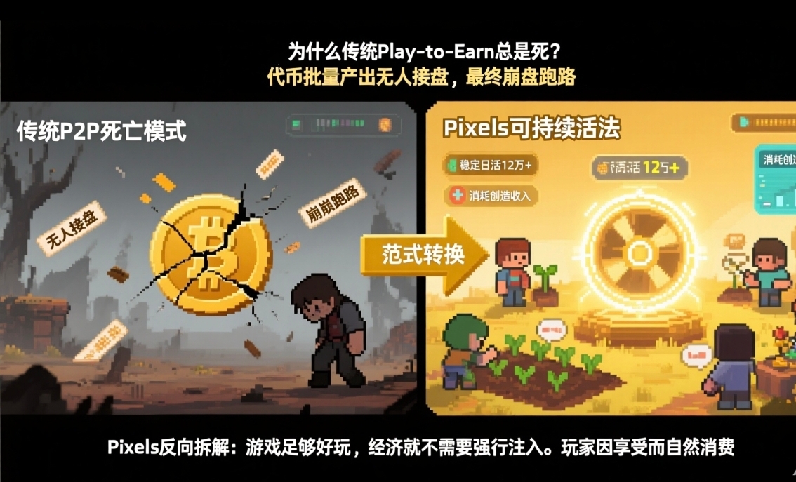 因为我觉得这个操作背后指向一个更大的问题,传统Play to Earn模式为什么总是死,活不了多久?现在我们都能看见市场上大多数链游,经济模型都只能靠激励支撑,项目的代币被批量产出后根本就是无人接盘,最终的结果基本都是崩盘跑路。@Pixels团队其实也可能踩过坑,但他们压根没跑,我看到他们是花了几年时间反向拆解了什么机制能活下去。我感觉他们的思路很直接,如果他们的游戏足够好玩足够吸引人能留住人,游戏经济就不需要用其他方式去强行注入或者引流,游戏里的玩家会因为享受体验或者虚荣心也好而自然去消费,不需要另外的引导,非常的自觉。