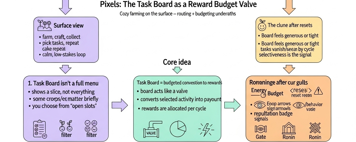 so Pixels starts looking less like a farming game and more like a routing system wrapped in a cozy world. tasks regulate how much value flows out. rewards push value back into spending. behavior affects what you’re allowed to see. reputation influences what becomes withdrawable. nothing about it has to be malicious for it to be true. it’s just design.