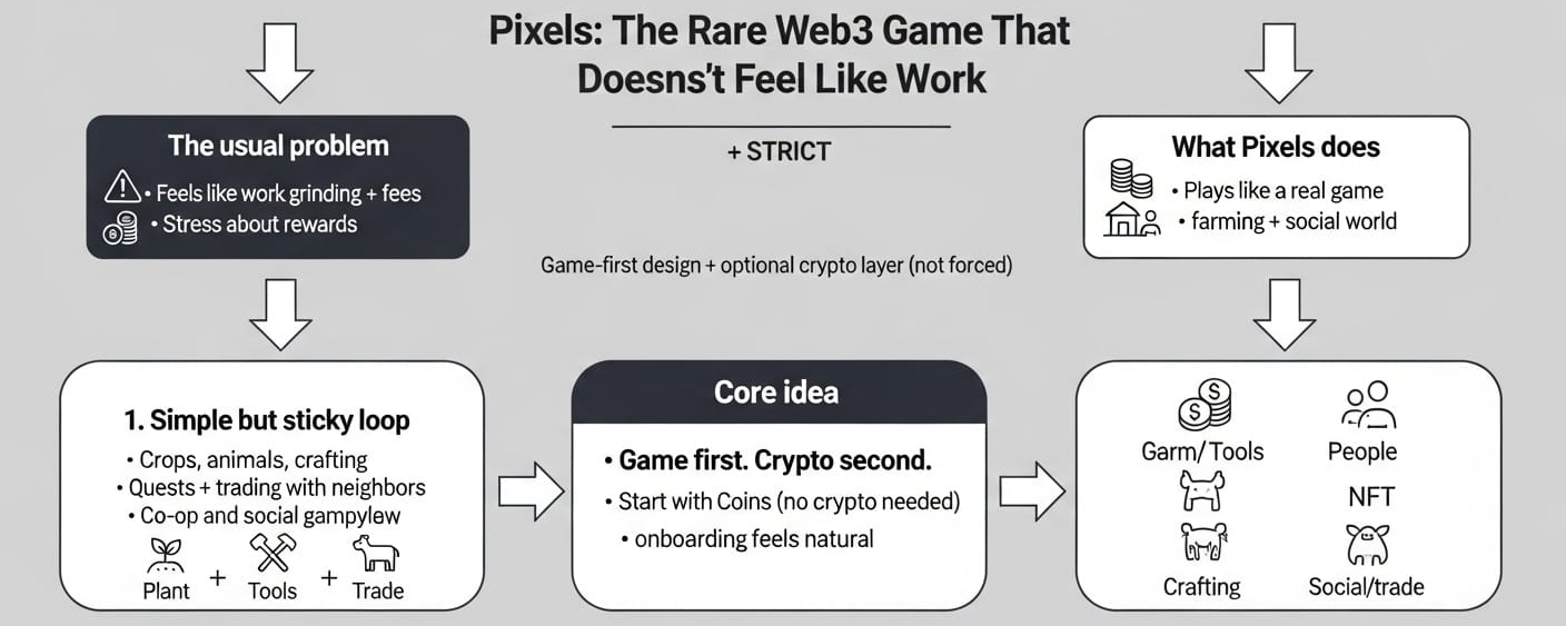 most web3 games feel like work wearing a game skin. you jump in for fun and quickly end up managing fees, grinding rewards, and stressing about whether the whole thing survives. Pixels stands out because it doesn’t lead with that energy. it’s a pixel-art open world on Ronin that plays like a real farming + social game first.