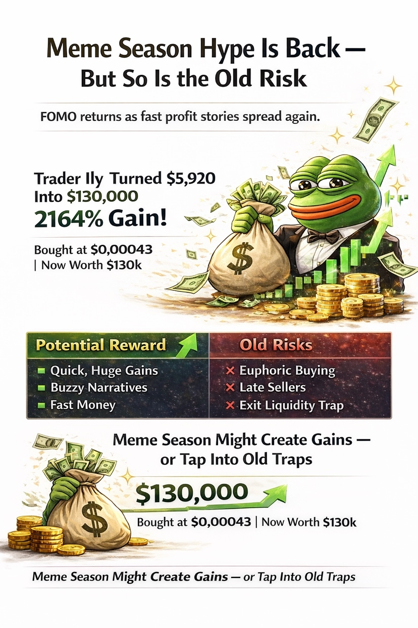 I always get cautious when the market starts talking about “meme season” again.That phrase usually appears right when traders begin to believe fast money is becoming normal. This time, the signal is coming alongside what some are calling “contract season,” with speculation rising that meme coins could be the next part of the cycle to heat up. The example getting attention is an address linked to Ily, which reportedly turned a $5,920 entry at $0.00043 into roughly $130,000 in profit, a return of around 2164%.$BTC