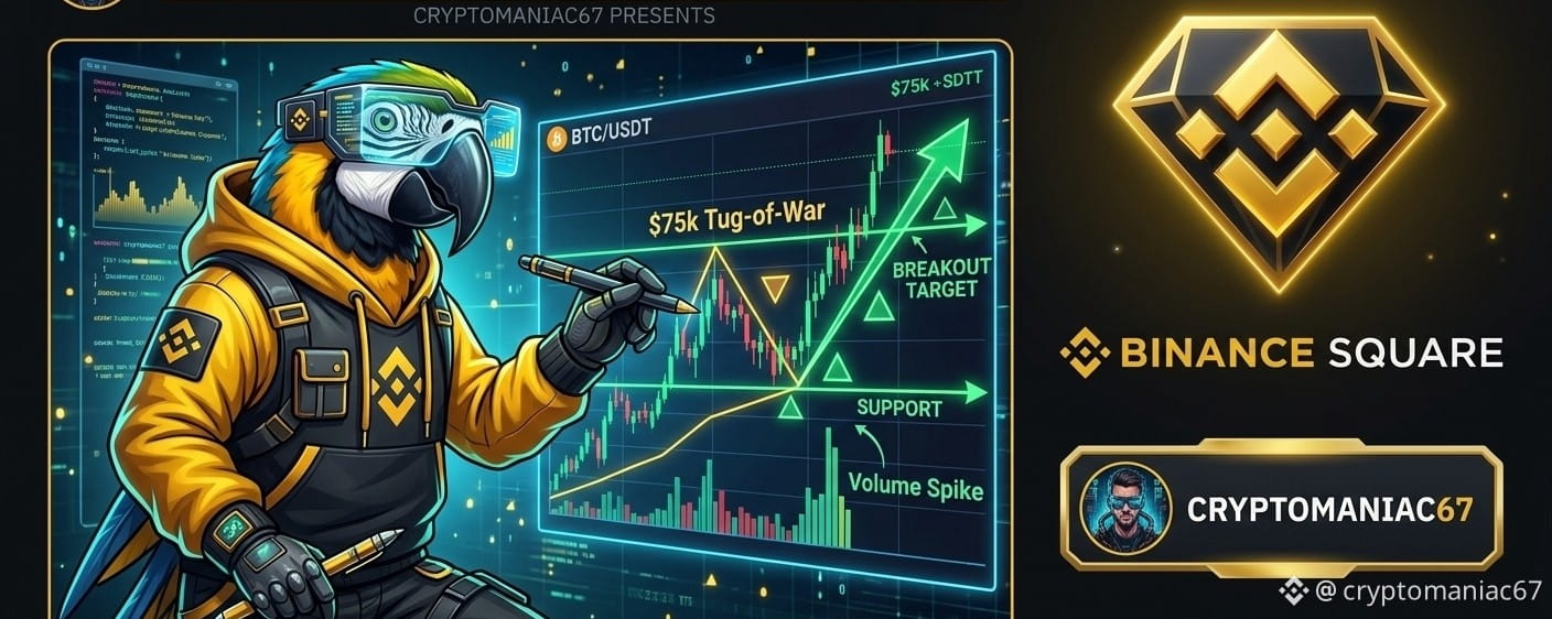 Bitcoin $BTC C is currently locked in a high-stakes battle at the $75,000 resistance level. After a solid recovery from the $62K floor earlier this year, we are seeing some serious compression. Here is what I’m watching today: