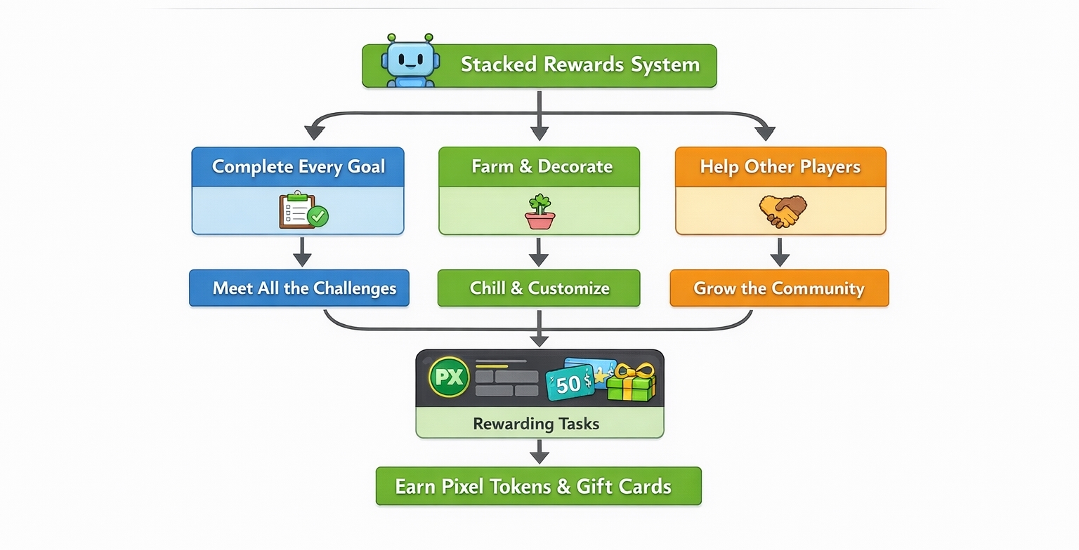 That brings me to the part that feels genuinely new in 2026. Stacked. The team quietly built this AI powered rewards layer that tracks how you actually play. Whether you are a completionist grinding every quest or someone who just logs in to chill and decorate. It matches you with meaningful tasks and streaks. Everything funnels into one clean app. You earn PIXEL tokens. But it is starting to expand toward gift cards and other real world redemptions. It does not feel like the old play to earn hamster wheel that burned everyone out in 2022. It feels closer to a loyalty program that actually respects your time.