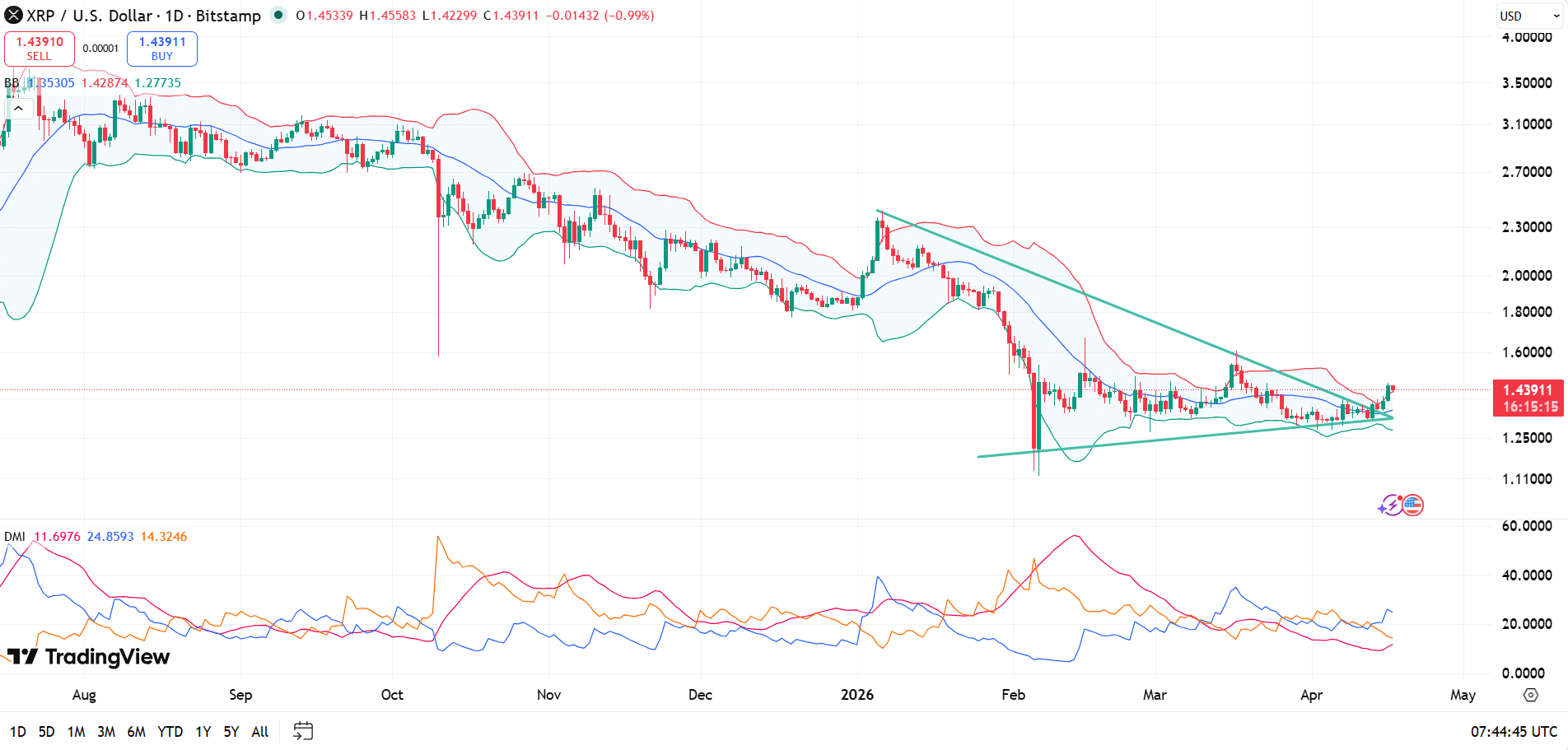 Jednocześnie XRP handluje nieco powyżej górnej bandy Bollingera na poziomie 1,4287 USD, która teraz stała się wsparciem. Ten poziom może pomóc w utrzymaniu ceny, jeśli spadnie. Poniżej tego, średnia bandy, która reprezentuje 20-dniową prostą średnią ruchomą (SMA), wynosi 1,35 USD i działa jako następny kluczowy poziom wsparcia, jeśli presja sprzedaży wzrośnie.