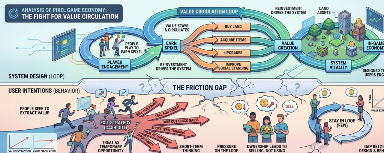 This is different from systems where assets can just sit there and hold value. In PIXEL inactivity actually hurts the system. Which means keeping users engaged is more important than getting users.