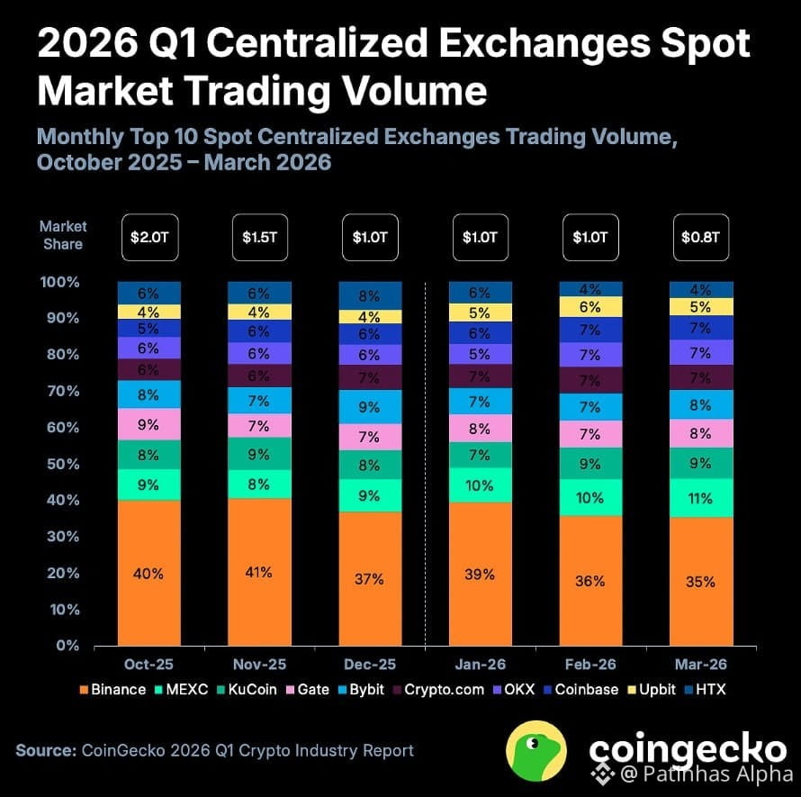 🟡 Os volumes de negociação à vista nas 10 maiores exchanges centralizadas caíram 39% no 1º trimestre de 2026