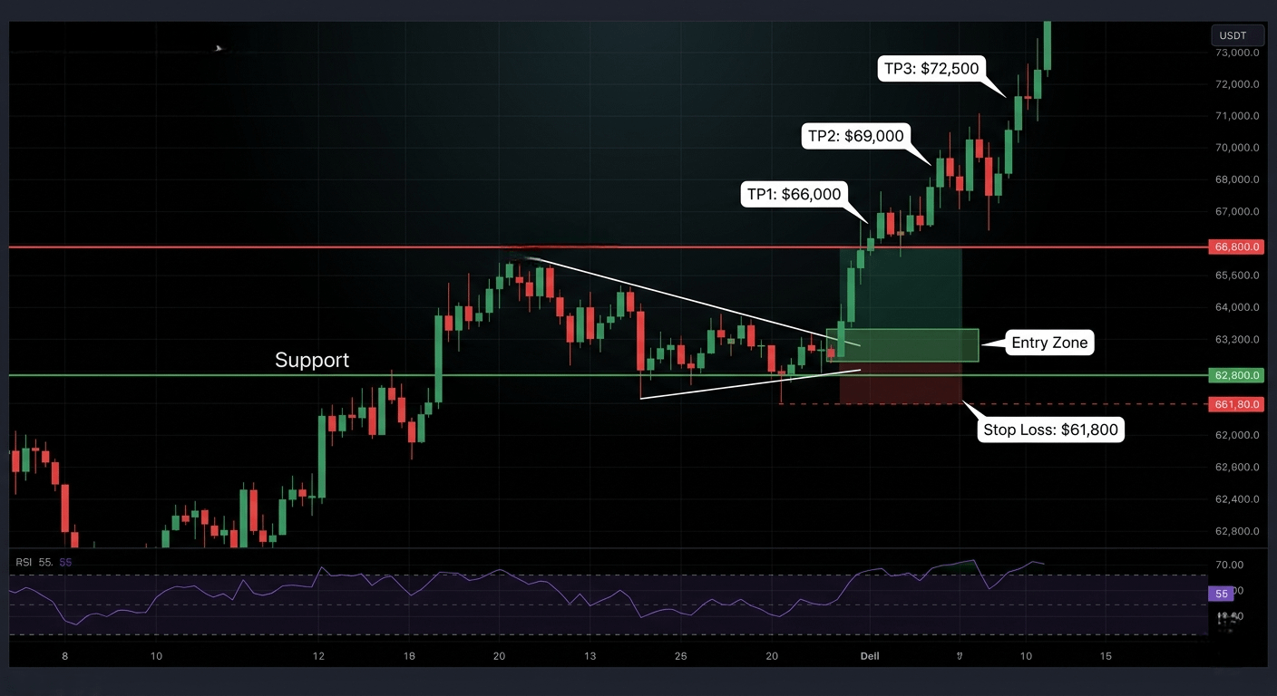 Take Profit: TP1: $66,000 | TP2: $69,000 | TP3: $72,500 (New ATH Attempt)