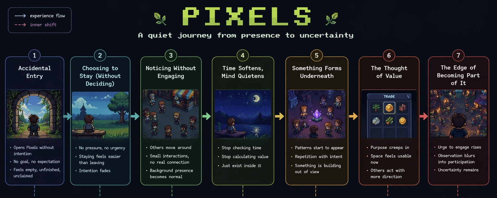 I’ve been thinking about Pixels, the way I open it without really deciding to, like it just happens in between other things, I focus but nothing is really happening yet, I move a little, stop, look again, wait without calling it waiting, and there’s this quiet sense that I should probably leave but I don’t, I just stay for a few seconds longer and then a few more until the idea of leaving fades into the background without me noticing