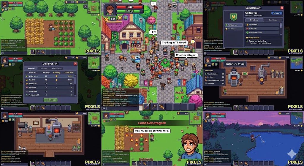 但在实操里,我也被Pixels坑过不少次。 记得那是Chapter 2刚更新的时候,官方搞了个公会系统。我当时心血来潮,觉得自己调研得够深了,直接冲进了一个叫“Wildgroves”的工会我以为能带着兄弟们开疆拓土,结果我真的服了,公会里的任务全是内卷。