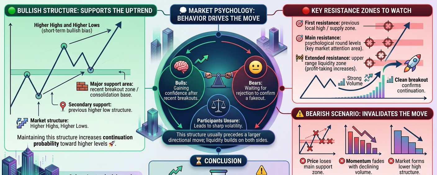 Price structure shows that buyers are gradually regaining control 📈, with recent moves suggesting accumulation after a period of consolidation. However, the market is now approaching key decision zones where volatility is expected to increase ⚠️.