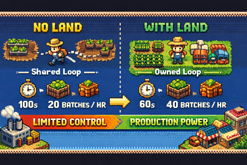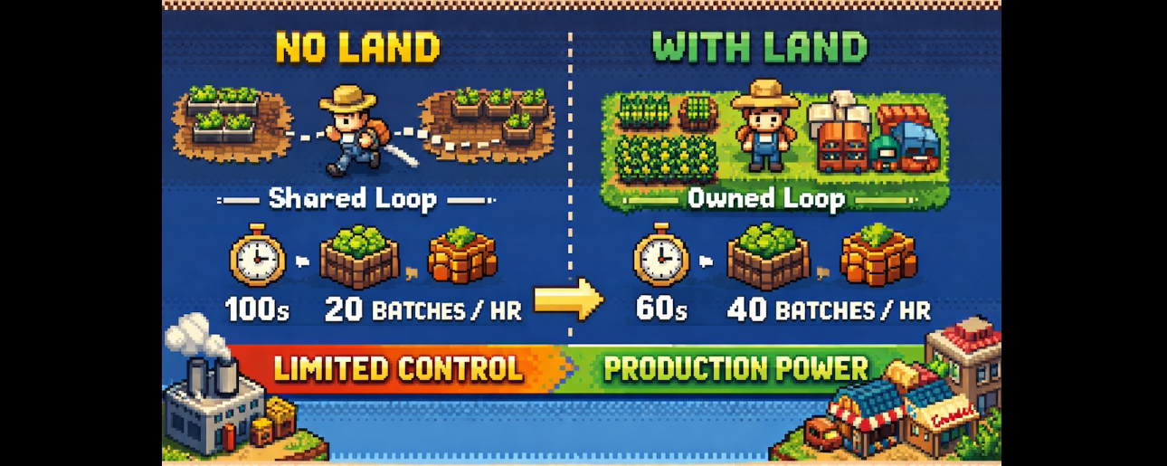 Mình hay nghĩ đơn giản thế này, không có land thì bạn đang dùng một shared production loop. Bạn vẫn farm, vẫn craft, nhưng loop đó không thuộc về bạn. Layout bị cố định, đường di chuyển không tối ưu, và bạn luôn phải thích nghi với một flow chung. Output vì thế lúc nhanh lúc chậm, khá khó để giữ một nhịp ổn định.
