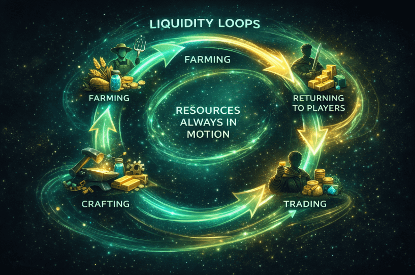 In many Web3 environments, moving assets, finding buyers, or converting value can feel like a separate process. It interrupts the experience. But when liquidity is integrated into the core loop, those steps become natural extensions of gameplay. You produce, you exchange, you reinvest—all without leaving the system.