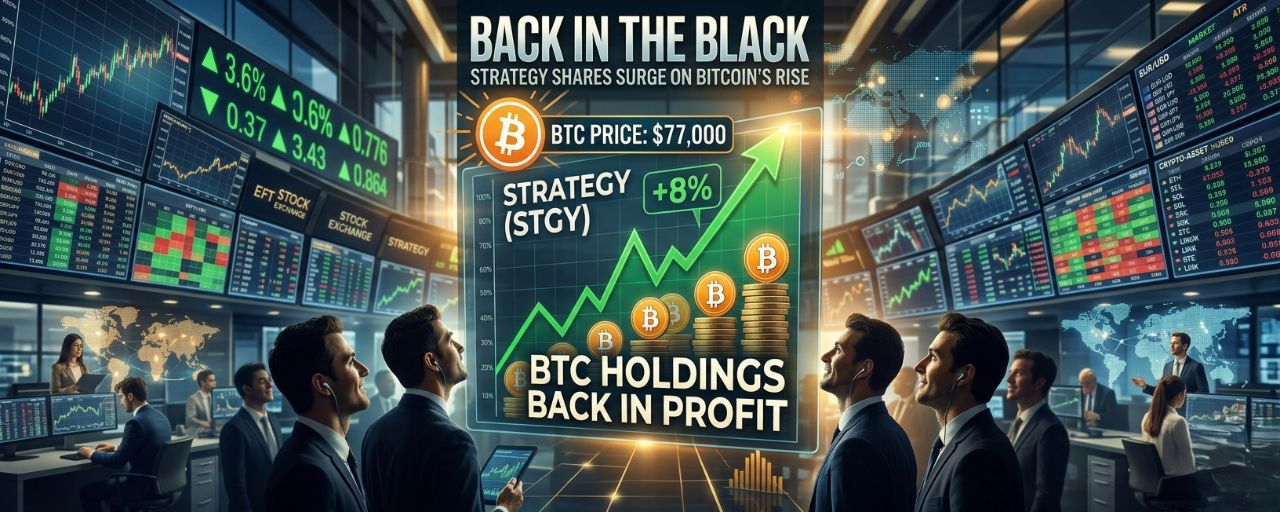Strategy, the company widely known for its aggressive Bitcoin accumulation strategy, saw its shares jump about 8% as Bitcoin climbed to around $77,000. The price move pushed the company’s large crypto holdings back into profit territory, reigniting market attention on one of the most closely watched corporate bets in digital assets.