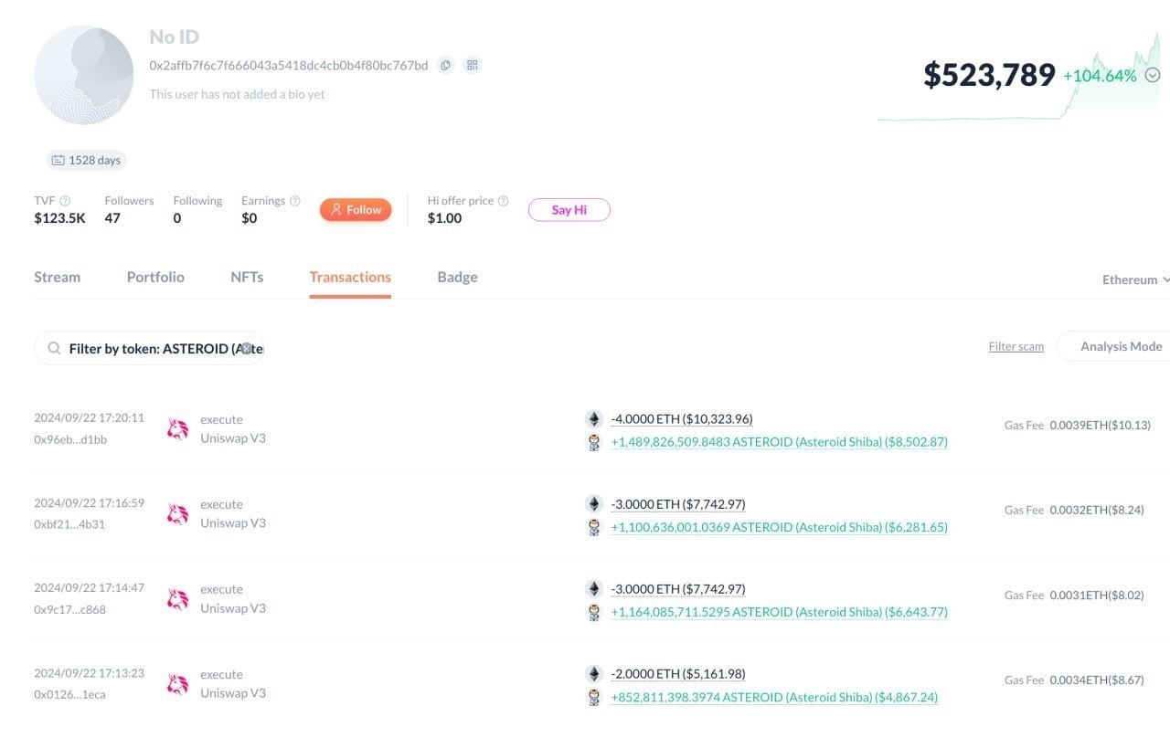 📈 On September 22, 2024, a cryptocurrency trader invested 12 ETH, worth $31,000, to buy 4.61 billion pieces of $ASTEROID.