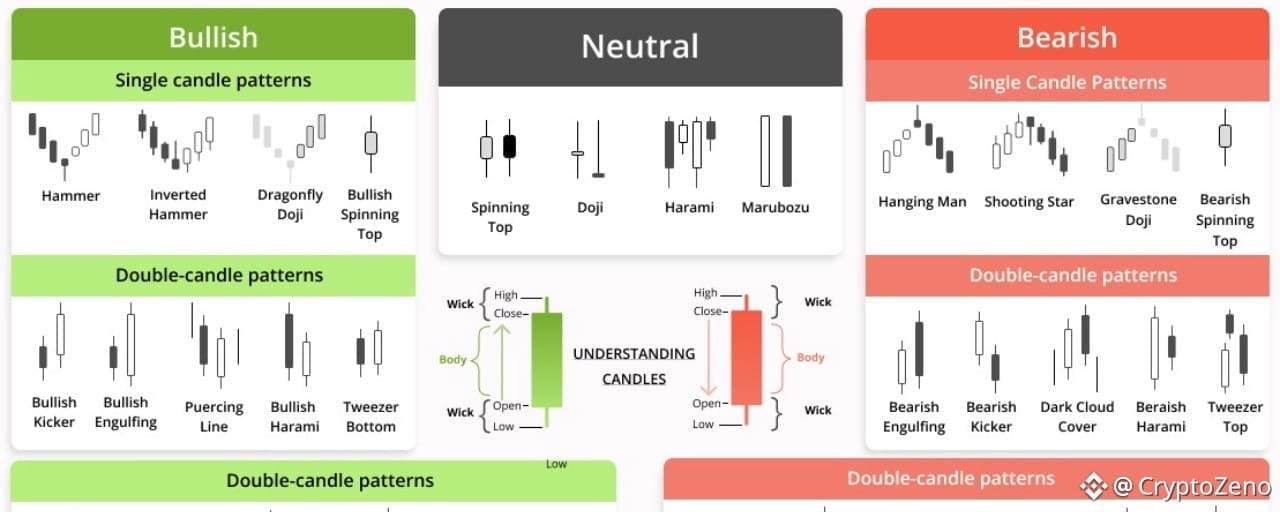 Teraz przejdźmy przez główne typy wzorów świecowych, aby nauczyć się, jak je wykrywać i czytać na wykresach kryptowalut.