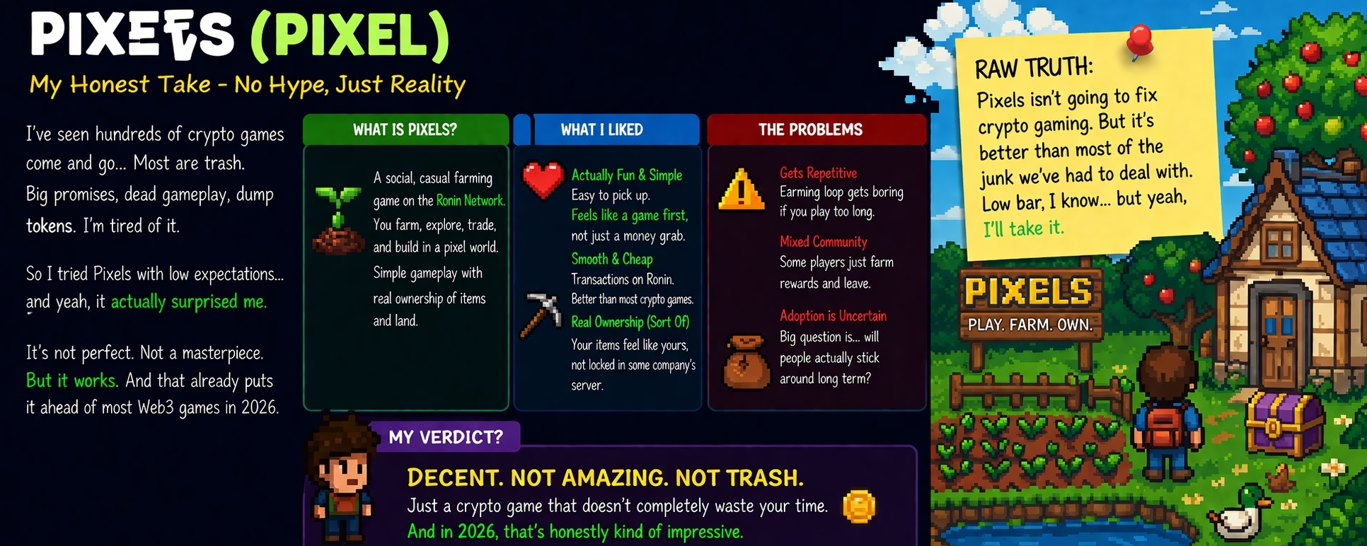 bro I’m gonna be honest… I went into Pixels thinking it’s gonna be the same garbage we’ve been seeing since like 2021, you know the type, shiny promises, dead gameplay, token dumps, rinse repeat… and I’m just tired at this point