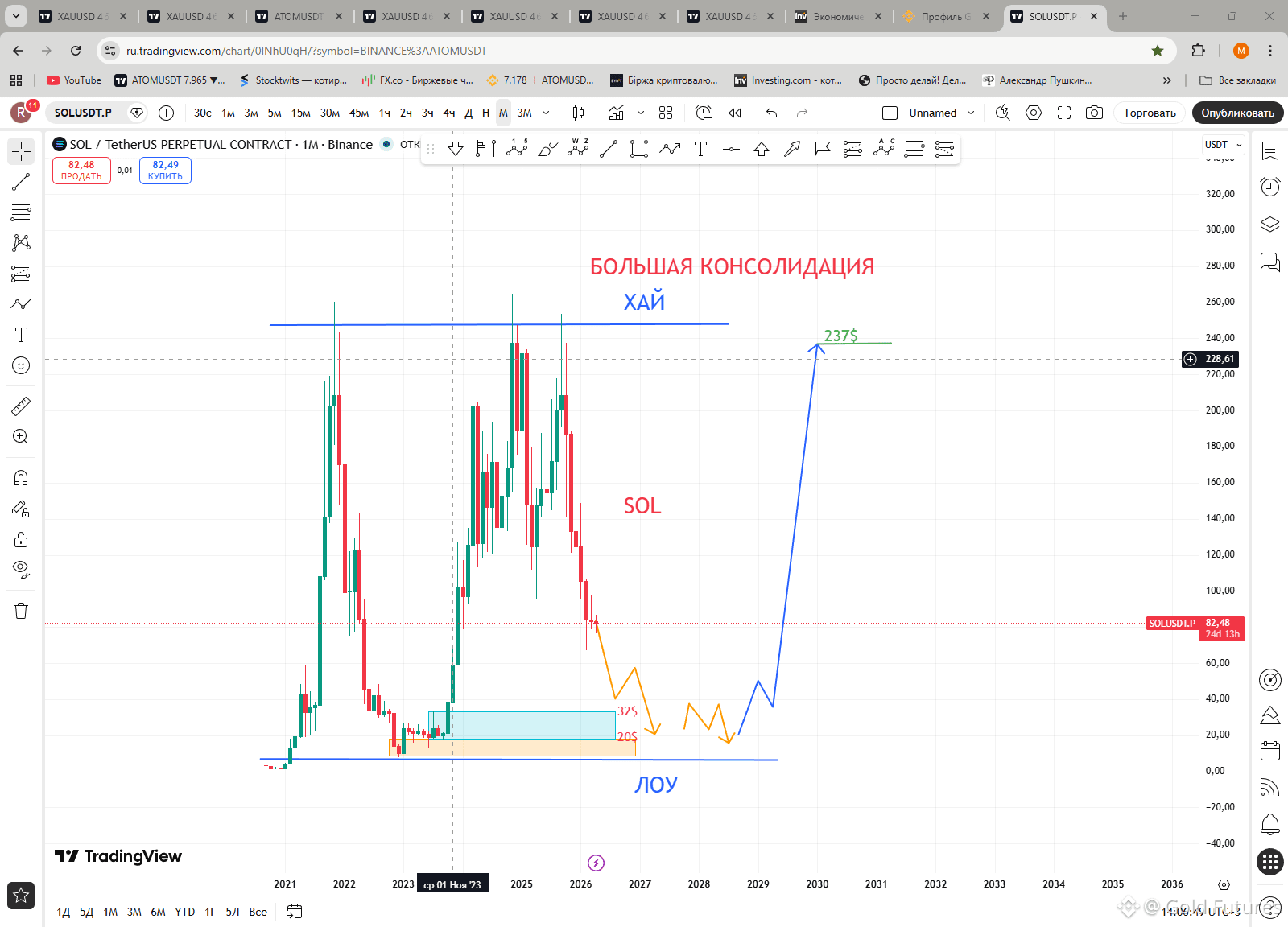 SOL находится в глобальной консолидации, и цена стремится к лоям (минимумам) диапазона. Это зона интереса крупного игрока, где ему будет выгодно аккумулировать свою позицию и пойти дальше покорять вершины. Вопрос только во времени: аккумуляция может продлиться долго, не всё так быстро. Биткоин также должен соответствовать бычьей структуре и общим настроениям.