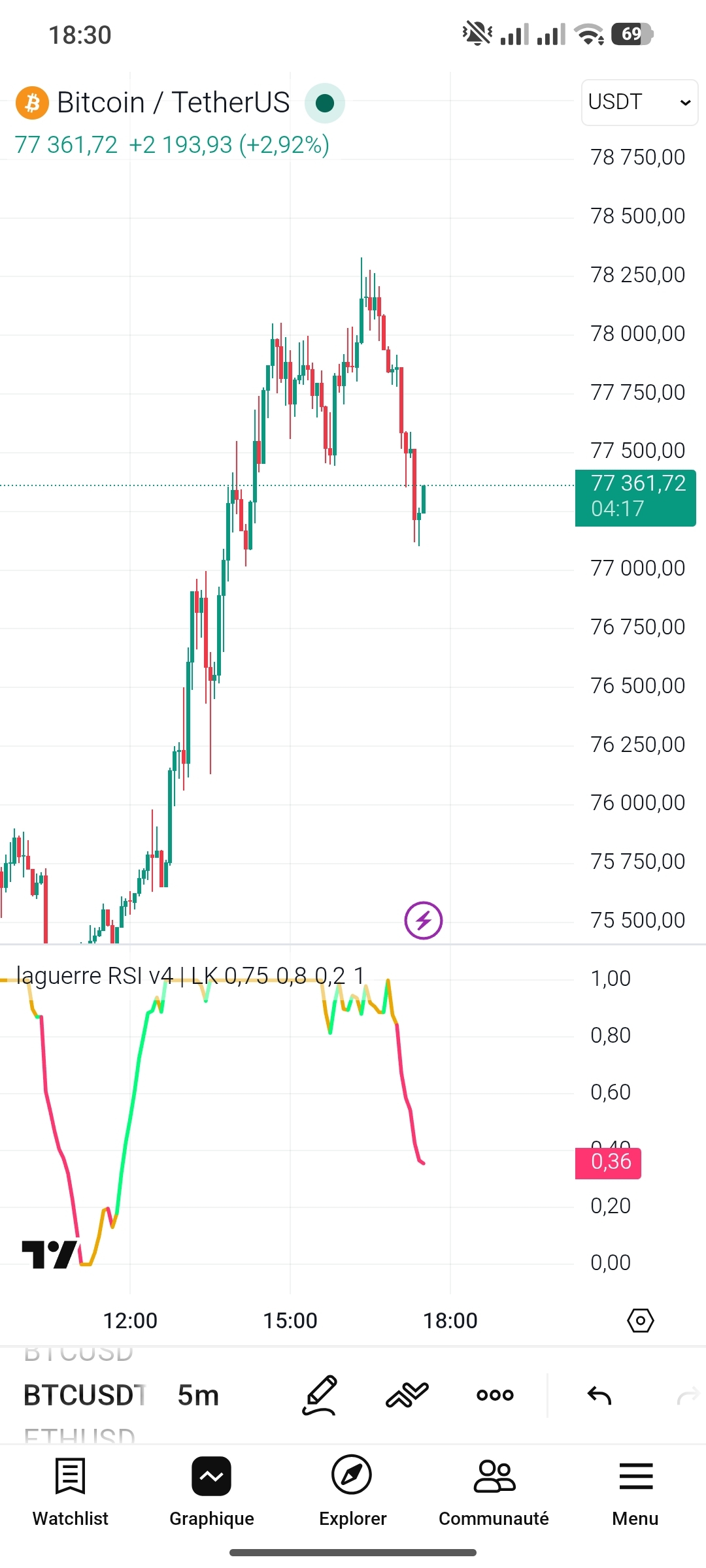 On the 5-minute timeframe, the structure is turning bearish. The failure to hold above 78,000 confirms seller dominance in the immediate term. The recent bounce lacks strength, suggesting it is corrective rather than the start of a new bullish leg. Momentum indicators, including Laguerre RSI, support this view as they continue trending downward without reaching a convincing reversal zone.