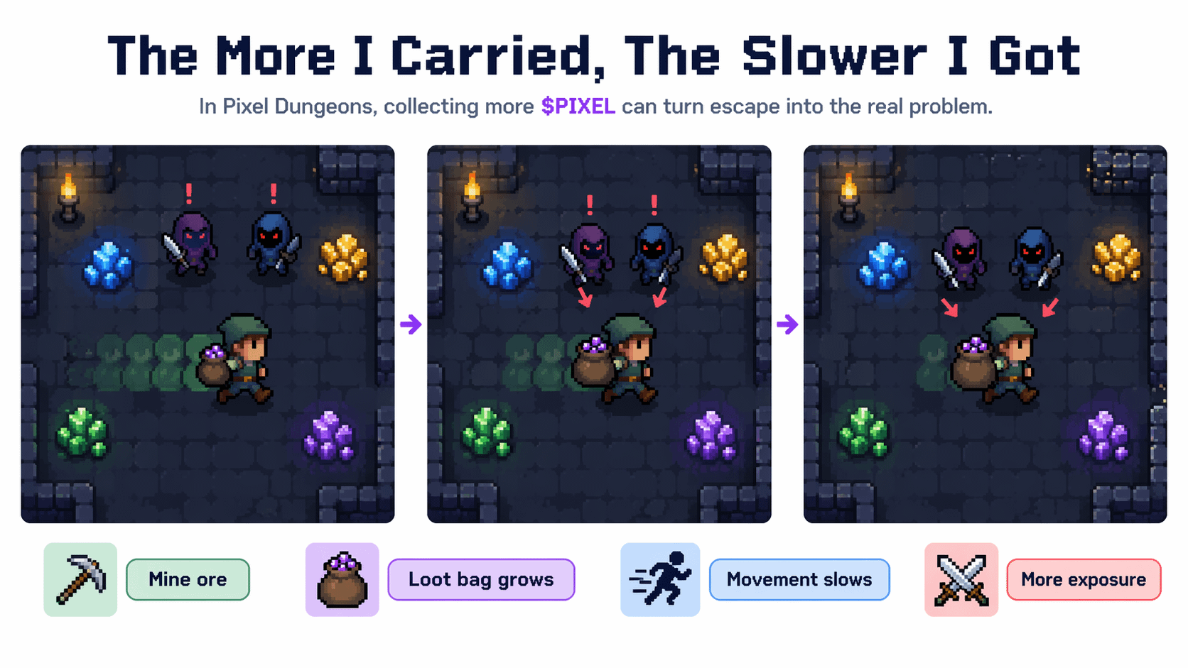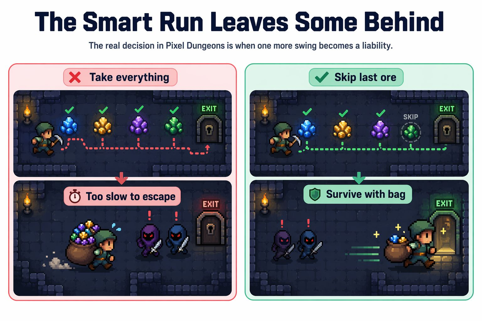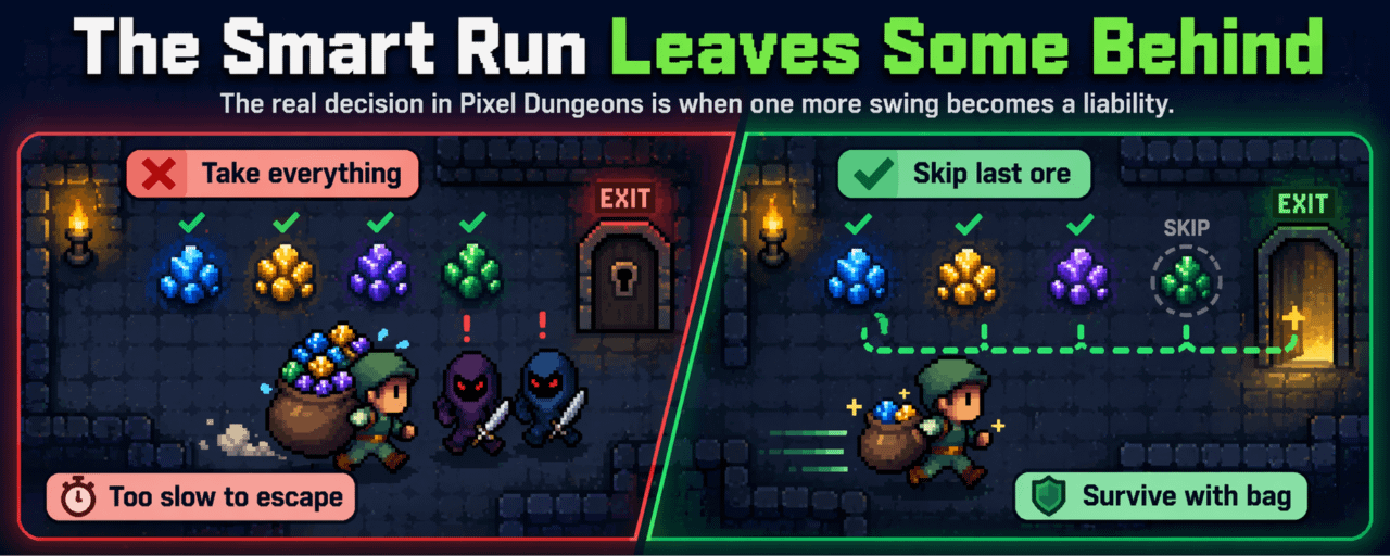 And the stupid part is I know better while I am doing it. That is the sunk cost trap right there. I have already spent the time. I already queued. I already mined half the bag. So my brain starts saying well I cannot leave now, not yet, not with ore still right there, not after putting this much into the run. Same feeling as staying in a trade too long because you want the extra move after the move already happened. Pixel Dungeons punishes that mindset immediately. The bag gets heavy, I start missing turns, and next thing I know it feels like everybody in the room is breathing down my neck while I am still trying to convince myself one more hit is somehow efficient.
