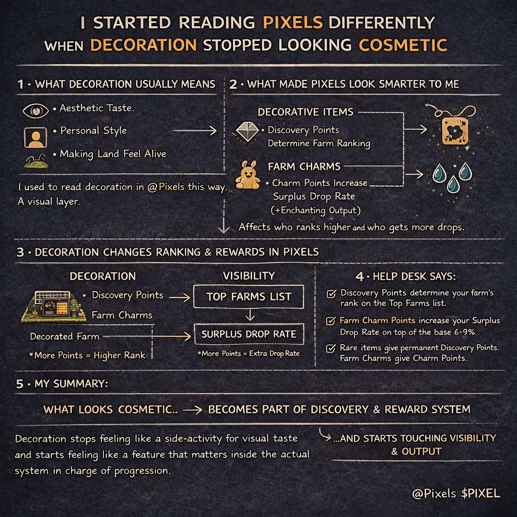 Because what looks cosmetic is often where systems hide some of their smartest decisions. Most people will still look at a decorated farm and just see effort, style, or status. I do not think that is the whole story anymore. I think Pixels is doing something more interesting than that. It is making decoration part of how land gets surfaced and part of how extra value can be created. That changes the meaning of the layer completely. It stops feeling like a side activity for players who care about visuals and starts feeling like a quieter form of optimization built into the world.