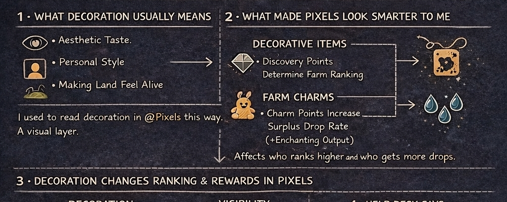 A weak system is comfortable letting cosmetic layers stay meaningless. It is happy for decoration to be decoration, because the real structure is elsewhere. That is easy to explain, but it is not very interesting. What caught my attention here is that Pixels quietly blurs that boundary. Rare items and Farm Charms do not just sit there to make your land feel premium. They directly contribute to Discovery Points, which means the system is effectively saying that presentation, curation, and item placement can change how visible your land becomes. I think that is a much more serious design choice than it looks at first glance.