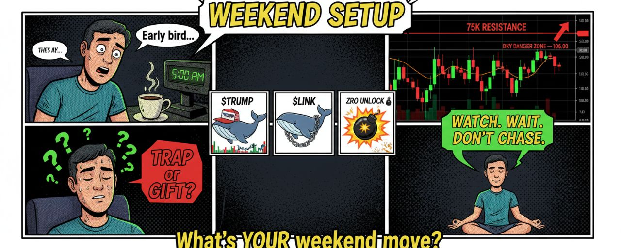 $75K BTC. Whale accumulation on TRUMP. LINK ETFs buying the dip. And a 25M token unlock is looming. This weekend is a trap or a gift.
