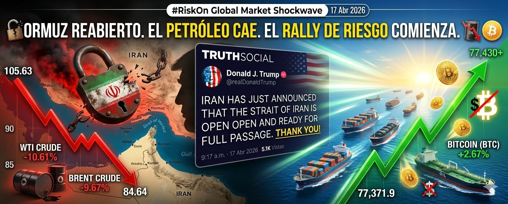 El Estrecho de Hormuz, la arteria por la que fluye el 20% del petróleo mundial ha sido declarado "totalmente abierto". Lo que hace 24 horas era una amenaza de Tercera Guerra Mundial, hoy es la chispa que ha encendido los mercados financieros.