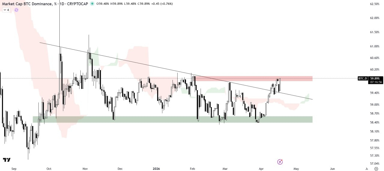 #BTC coin Dominance is attempting to break above the horizontal supply zone following a breakout from the descending triangle pattern.