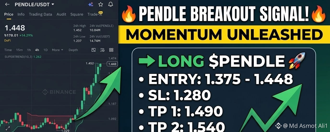 The chart shows a powerful bullish expansion. $PENDLE has successfully flipped its previous resistance into a launchpad, supported by a massive spike in buying volume. The SuperTrend is firmly green, and the MACD is showing strong upward divergence, confirming that the bulls are in full control.