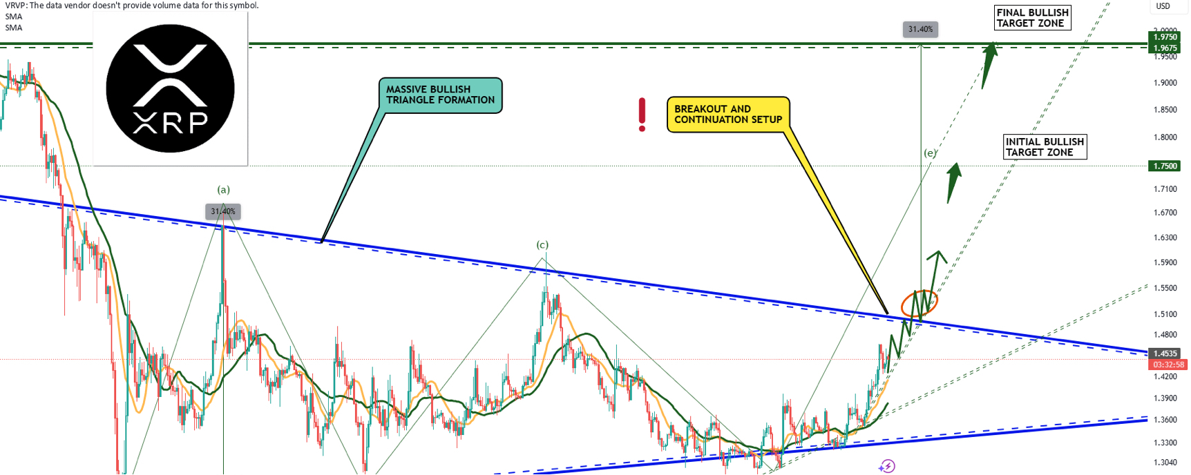 Jak widać na moim wykresie, XRPUSD utworzył tę gigantyczną formację trójkąta. Ta formacja jest zasadniczo formacją dna, z której wyłania się wzrostowy odwrót i kontynuacja wybicia w górnych sferach.