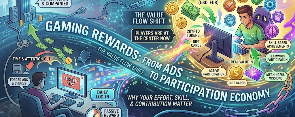 Now a new model is starting to grow. In this model players can earn real value like cash crypto or gift cards for doing things that actually matter inside the game. Not random clicks. Not fake tasks. Not sitting idle just to farm rewards. And not watching endless ads that break the flow of gameplay.