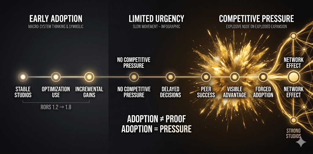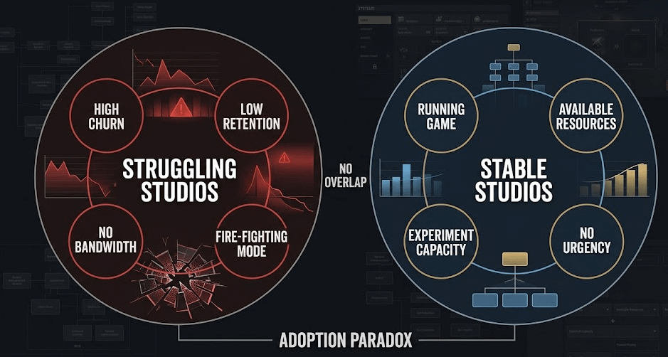 Đây là vòng lặp mà bất kỳ B2B infrastructure nào nhắm vào game studios cũng phải navigate. User base ban đầu là những người không cần thay đổi ngay. Kết quả từ họ thuyết phục nhưng không tạo ra competitive pressure đủ mạnh để kéo wave tiếp theo vào nhanh. Network effect hình thành, nhưng chậm hơn so với infrastructure được adopt vì survival pressure.