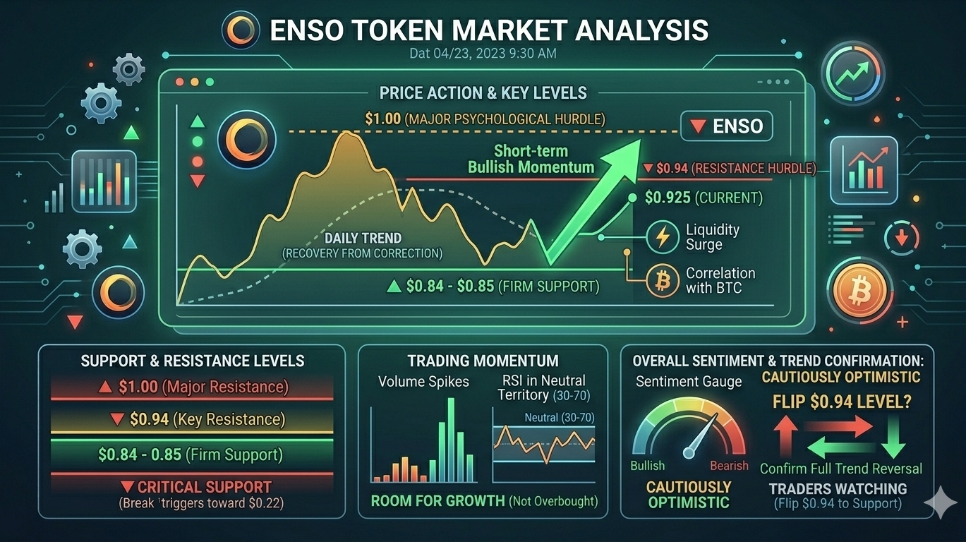 $ENSO is currently showing short-term bullish momentum, trading around $0.925 following a solid 6% gain in the last 24 hours. While the broader daily trend remains weak after a recent correction, immediate price action is supported by a liquidity surge and a positive correlation with Bitcoin’s rally. Technical support is firm between $0.84 and $0.85, while traders face resistance at $0.94, with a major psychological hurdle at $1.00. Trading momentum is picking up as volume spikes, though the RSI remains in neutral territory, suggesting there is still room for growth before becoming overbought. Overall sentiment is cautiously optimistic, with practical eyes on whether ENSO can flip the $0.94 level into support to confirm a full trend reversal.