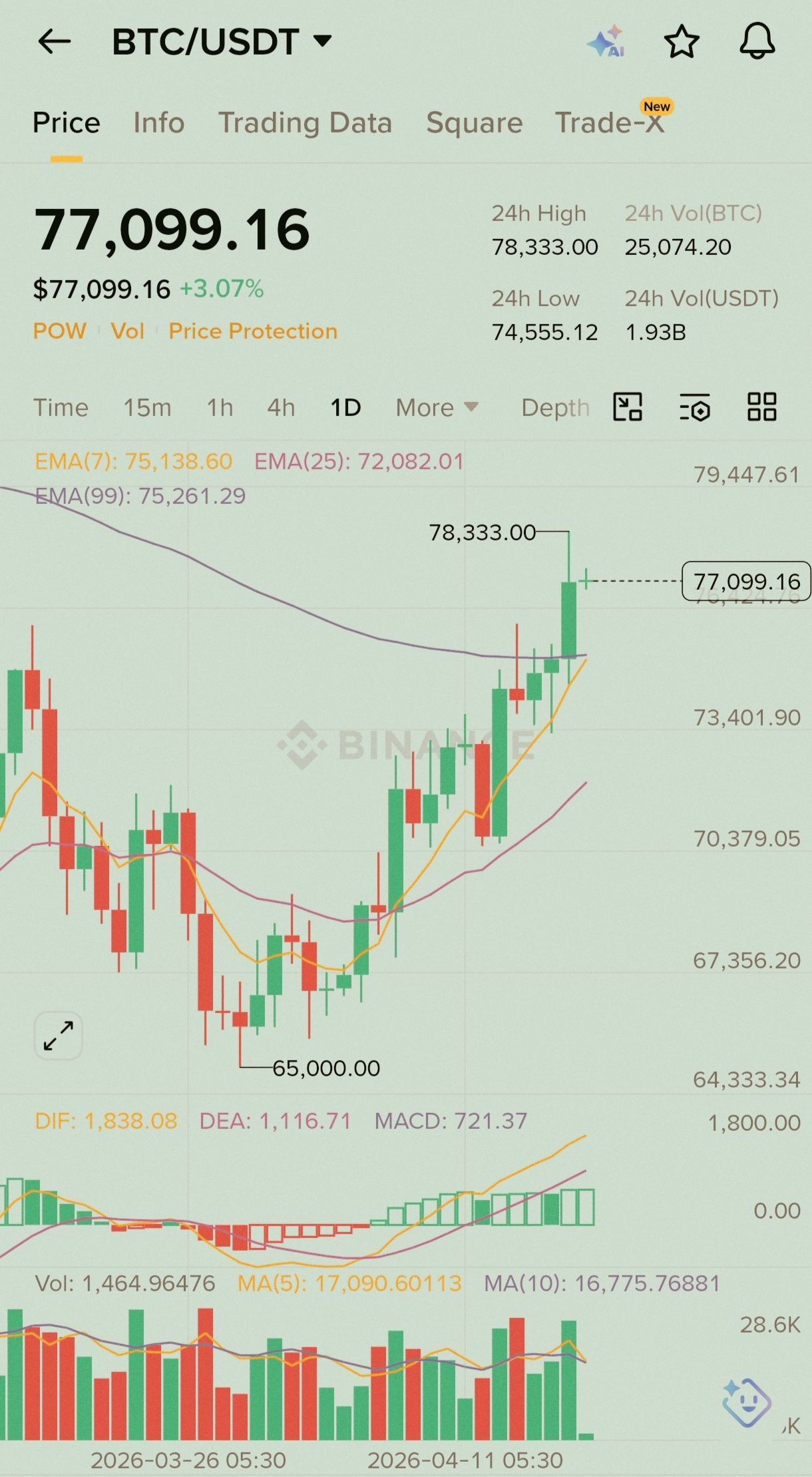 If price holds above $75,260 (EMA99) and volume picks up, the next target is $78,333. A clean break above that opens the door to $80,000 and potentially $82,000.