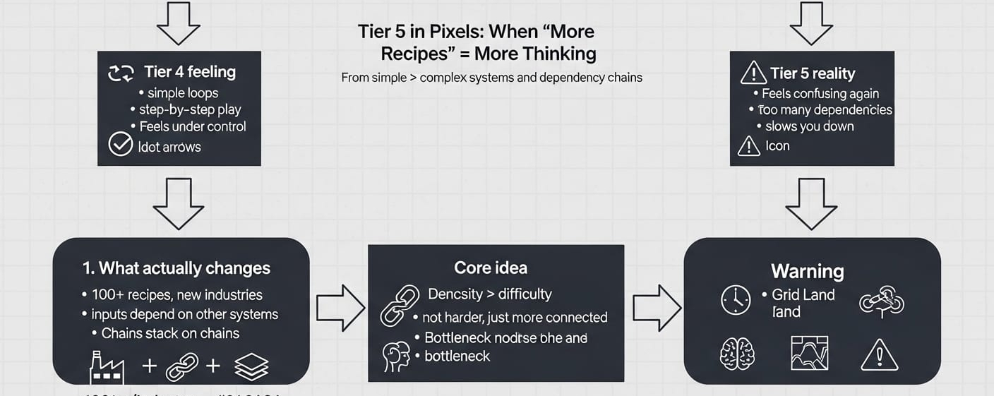 on the surface Tier 5 looks like simple expansion. new industries, 100+ recipes, new materials. but the real change is density. in Tier 4 you can often think in steps: do this, wait, harvest, repeat. in Tier 5 you have to think in systems. one input depends on two older industries. those industries depend on upgraded land setups. suddenly “more recipes” isn’t content, it’s dependency chains stacked on dependency chains.