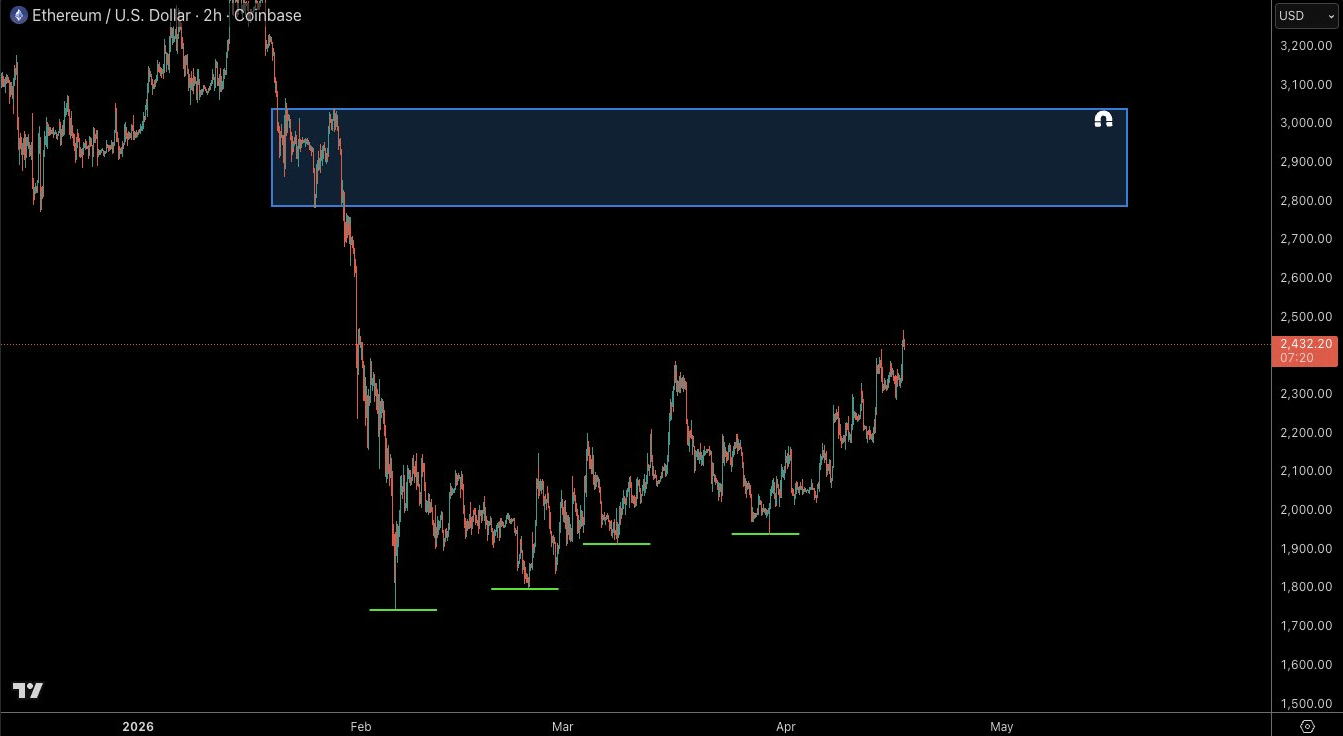 Następny główny obszar oporu leży mniej więcej między 2 800 USD a 3 000 USD, z najistotniejszym naciskiem na część 2 800 - 2 900 USD tego zakresu. To ten sam obszar, w którym ETH wcześniej handlowało przed spadkiem, co czyni go naturalną strefą oporu przy każdym dalszym odbiciu.