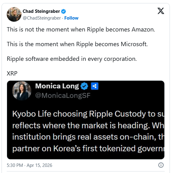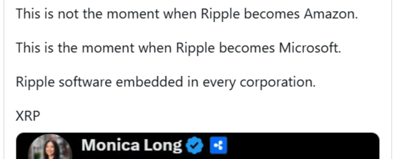 Reagując na ten rozwój, Steingraber argumentował, że ten moment nie powinien być postrzegany jako ewolucja Ripple w firmę taką jak Amazon. Zamiast tego porównał trajektorię do Microsoftu, podkreślając integrację oprogramowania zamiast dominacji skierowanej do konsumentów. Stwierdził, że ten etap reprezentuje, jak Ripple staje się wbudowane w infrastrukturę korporacyjną, z oprogramowaniem potencjalnie zintegrowanym w różnych instytucjach.
