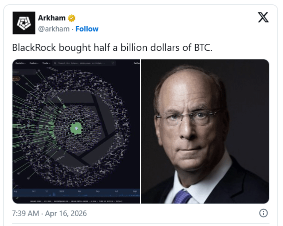 Data from Arkham Intelligence shows that the purchases were made over two days. The timing is important. In the weeks leading up to this, BlackRock had been reducing its exposure, so this marks a clear shift in direction, even if it is still early.