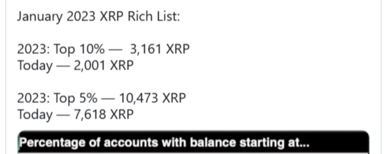 Zgodnie z przedstawionymi danymi, posiadanie 3,161 XRP w styczniu 2023 roku było wystarczające, aby umieścić konto wśród 10% wszystkich portfeli XRP.