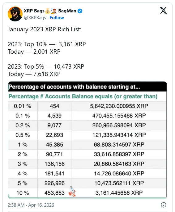 $XRP Ostatni post na X od entuzjasty XRP XRPBags przedstawia zaktualizowane dane na temat listy bogatych w XRP, podkreślając znaczną zmianę w ilości XRP wymaganej do zakwalifikowania się wśród najlepszych posiadaczy.
