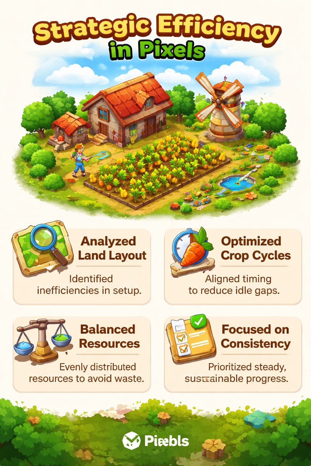 Today in $PIXEL I approached my gameplay with a deeper focus on efficiency and long-term structure rather than short-term expansion. I analyzed my entire land configuration to understand where performance was not optimal. The main issue was not activity, but inconsistency in timing and resource flow. I corrected crop cycles to reduce overlap and ensured smoother transitions between production stages. I also removed idle gaps that were quietly reducing overall output efficiency.