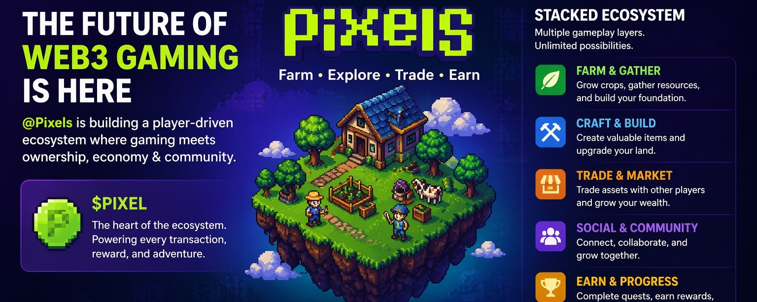 What makes Pixels unique is its “Stacked Ecosystem” approach, where gameplay is not limited to a single activity. Instead, it combines farming, crafting, exploration, guild participation, NFT ownership, and token rewards into one interconnected system. Every action in the game contributes to player progression and economic growth within the ecosystem.
