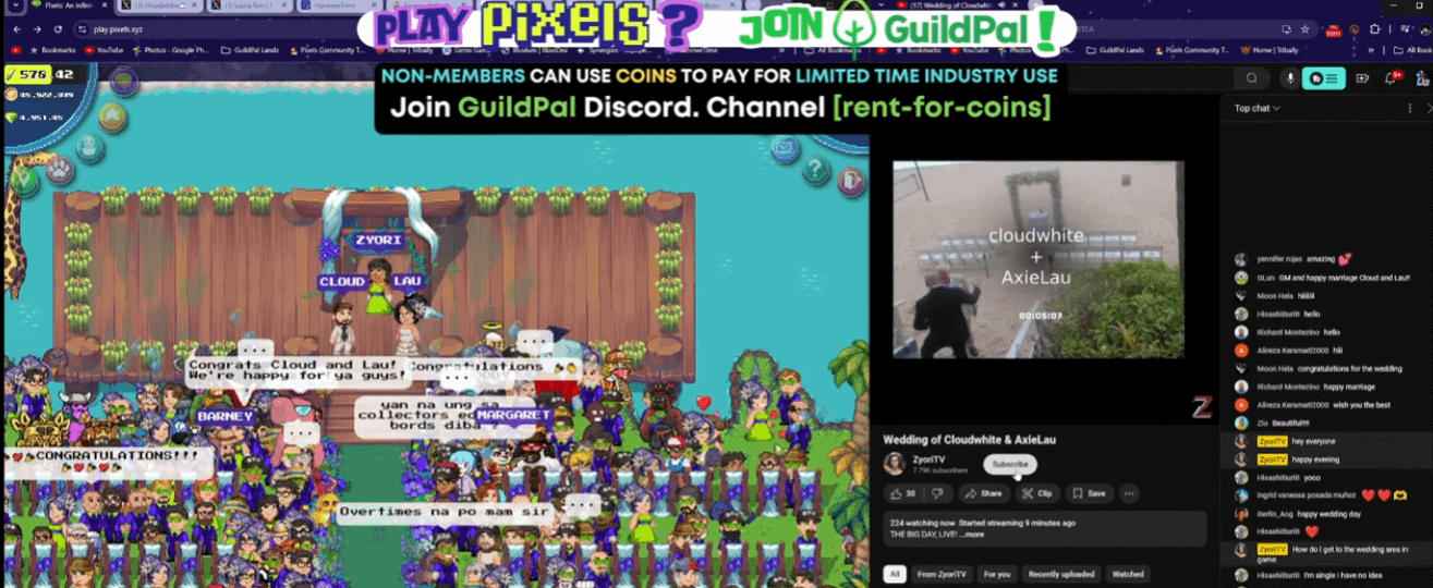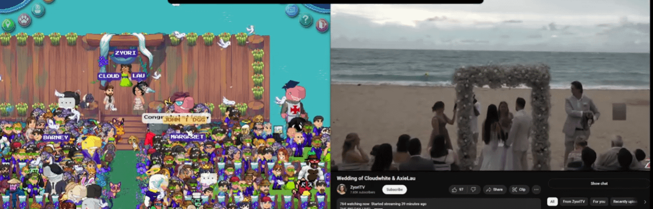 Cloudwhite and Laura got married inside Pixels in September 2024 at Terra Villa Central, while also having a real world ceremony at the same time. They met years earlier at AxieCon in Barcelona, both tied into the same broader ecosystem through Ronin.