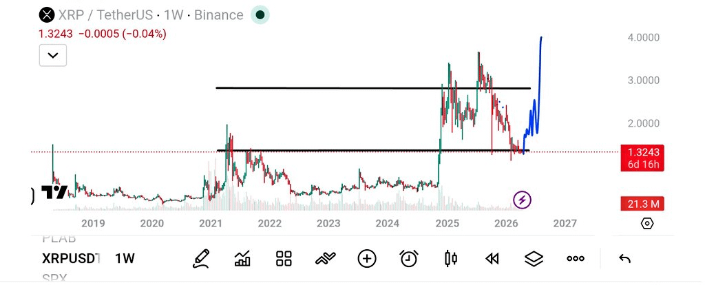 Udostępniony tygodniowy wykres podkreśla długo utrzymującą się strefę oporu między $3.00 a $3.60, która historycznie ograniczała wzrosty. XRP wcześniej wzrosło do tego regionu podczas rajdów w 2024 i 2025 roku, ale miało trudności z utrzymaniem momentum powyżej niego.