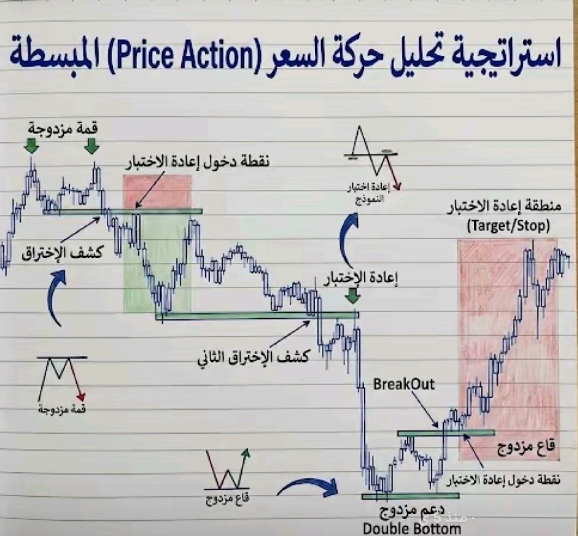 | **1. قمة مزدوجة** | صعود فشل | ⚠️ | انتظر الكسر |