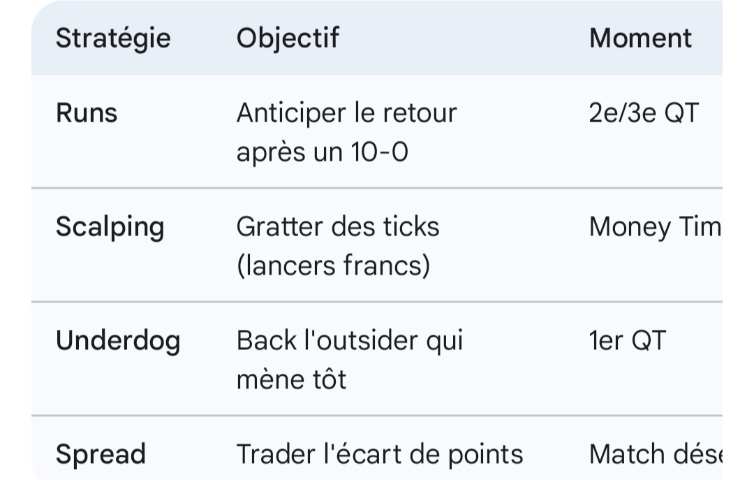 Voici les spécificités et stratégies pour le trading NBA en 2026 :