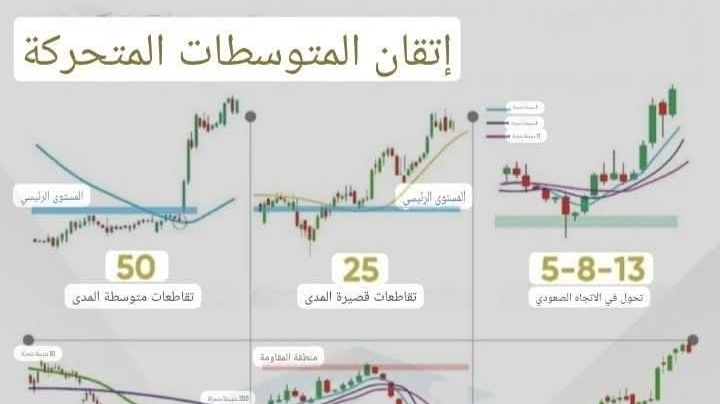 هذه الصورة تجمع أهم استخدامات المتوسطات المتحركة في قراءة الاتجاه، تحديد نقاط الدخول والخروج، ومعرفة التحولات القوية في الترند: