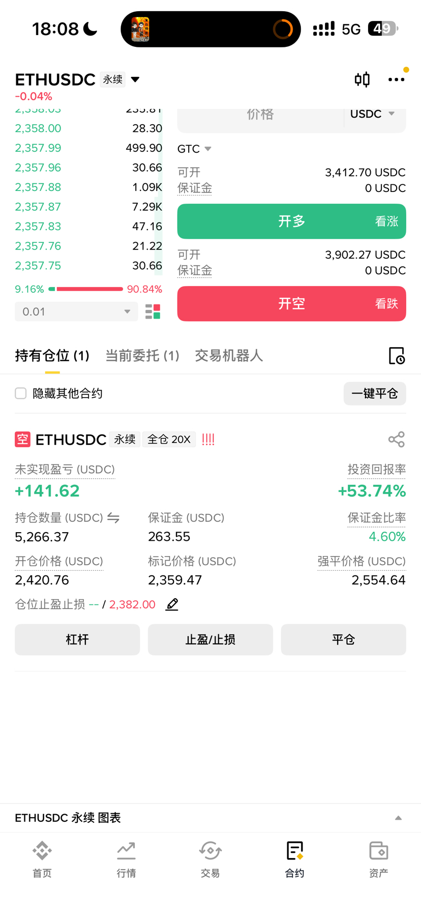 虽然我是小白,但我不是赌狗。开仓瞬间我就挂了2382的止损单,真要是突突上去,我最多亏个几十U,就当交学费。结果行情非常给面子,一路阴跌到2357,浮盈直接飙到53%。
