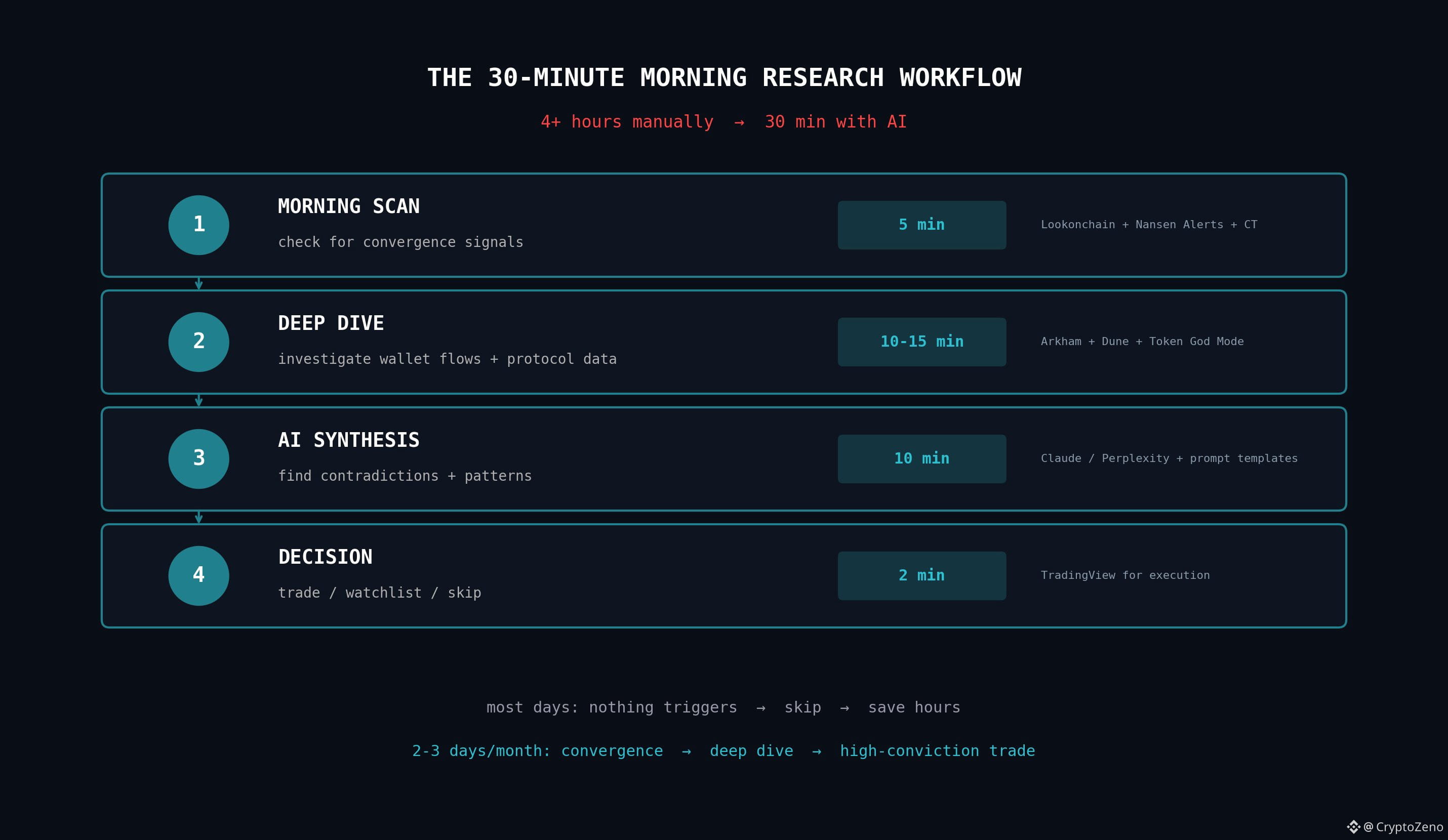Narzędzia są bezużyteczne bez systemu. Oto rzeczywisty przepływ pracy, który wykonuję każdego ranka. Obecnie zajmuje mi to około 25–30 minut. Kiedyś, gdy robiłem to ręcznie, zajmowało mi to ponad 4 godziny.