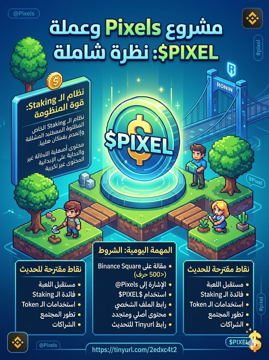 تعتمد قوة مشروع @Pixels بشكل كبير على عملة $PIXEL ، والتي تلعب دوراً محورياً في كافة تفاعلات اللعبة. ومن أهم النقاط التي يجب التركيز عليها هي منظومة "Staked" الخاصة بالمشروع، حيث تتيح للمستخدمين والمستثمرين فرصة تعظيم فوائدهم من خلال الاحتفاظ بالعملة ودعم استقرار الشبكة. هذا التوجه يعزز من قيمة العملة على المدى الطويل ويجعلها ملاذاً جيداً للمهتمين بقطاع الـ GameFi.